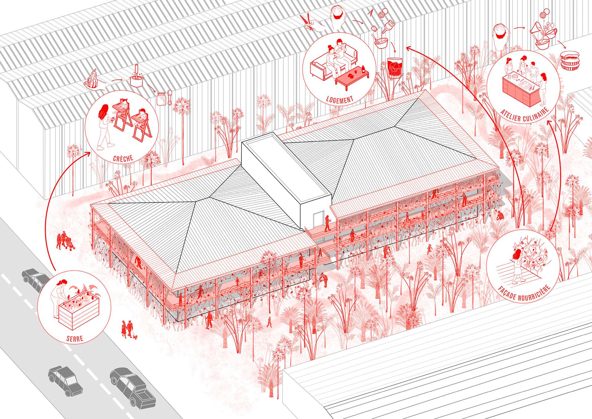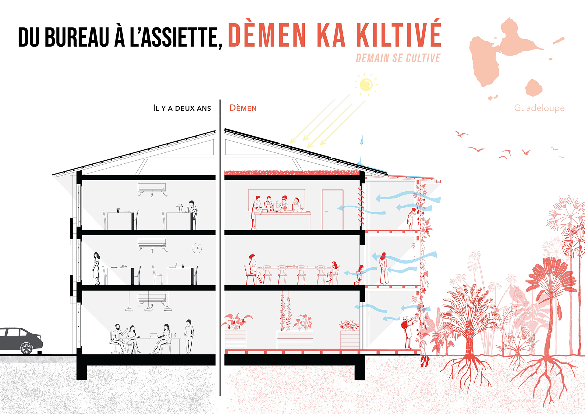 Ce projet propose la transformation d’une ancienne agence bancaire vacante en Guadeloupe en un lieu nourricier et résilient. Face à l’intensification des pluies, à la chaleur croissante et aux sols fragilisés, l’architecture choisit de composer avec le climat tropical plutôt que le contraindre.