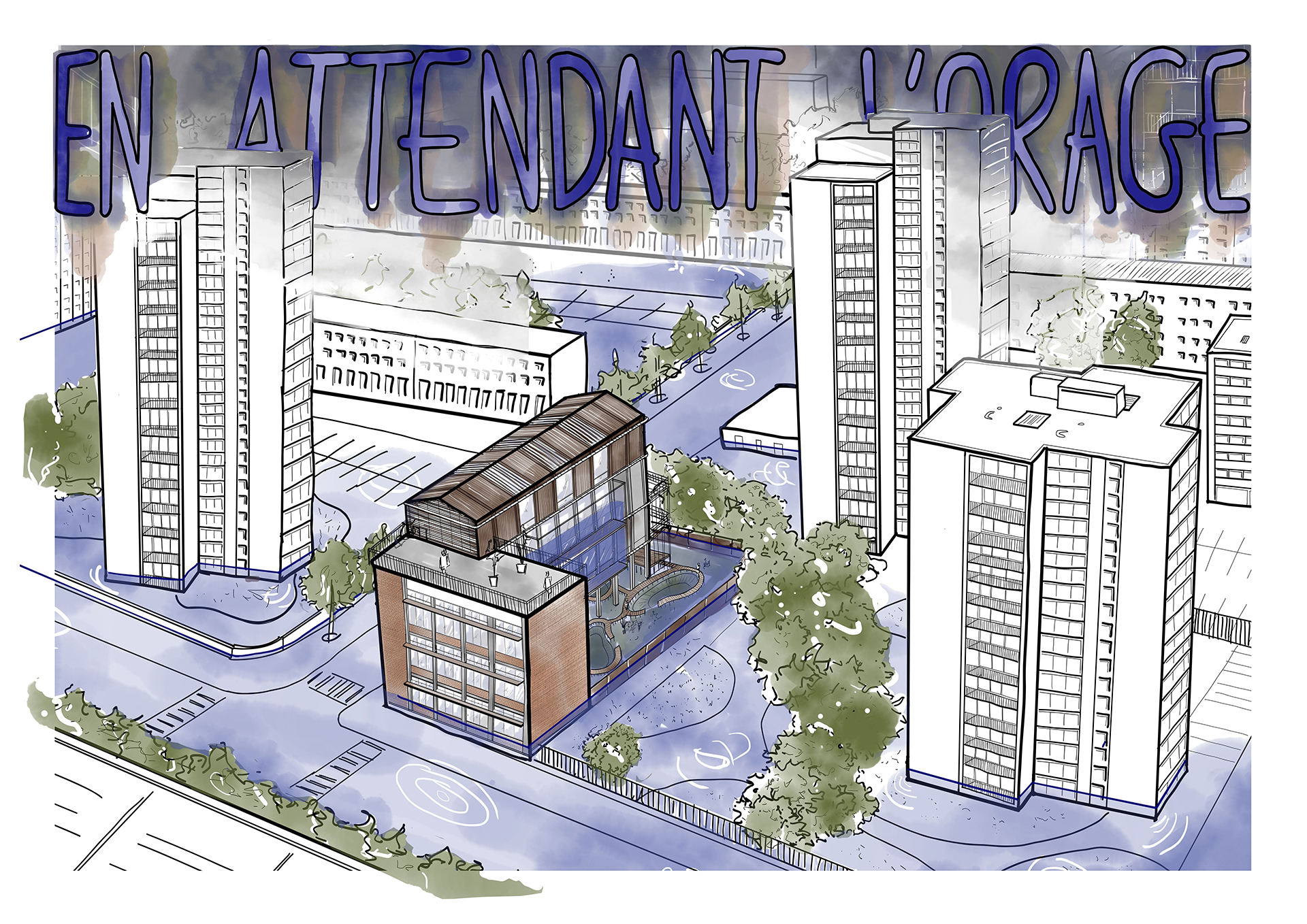En faisant de l’eau non plus une contrainte mais une ressource, « En attendant l’orage » propose un modèle reproductible à l’échelle urbaine. Multipliées dans la ville, ces architectures formeraient un réseau de réservoirs capables d’absorber les excès hydriques tout en recréant du lien social.
