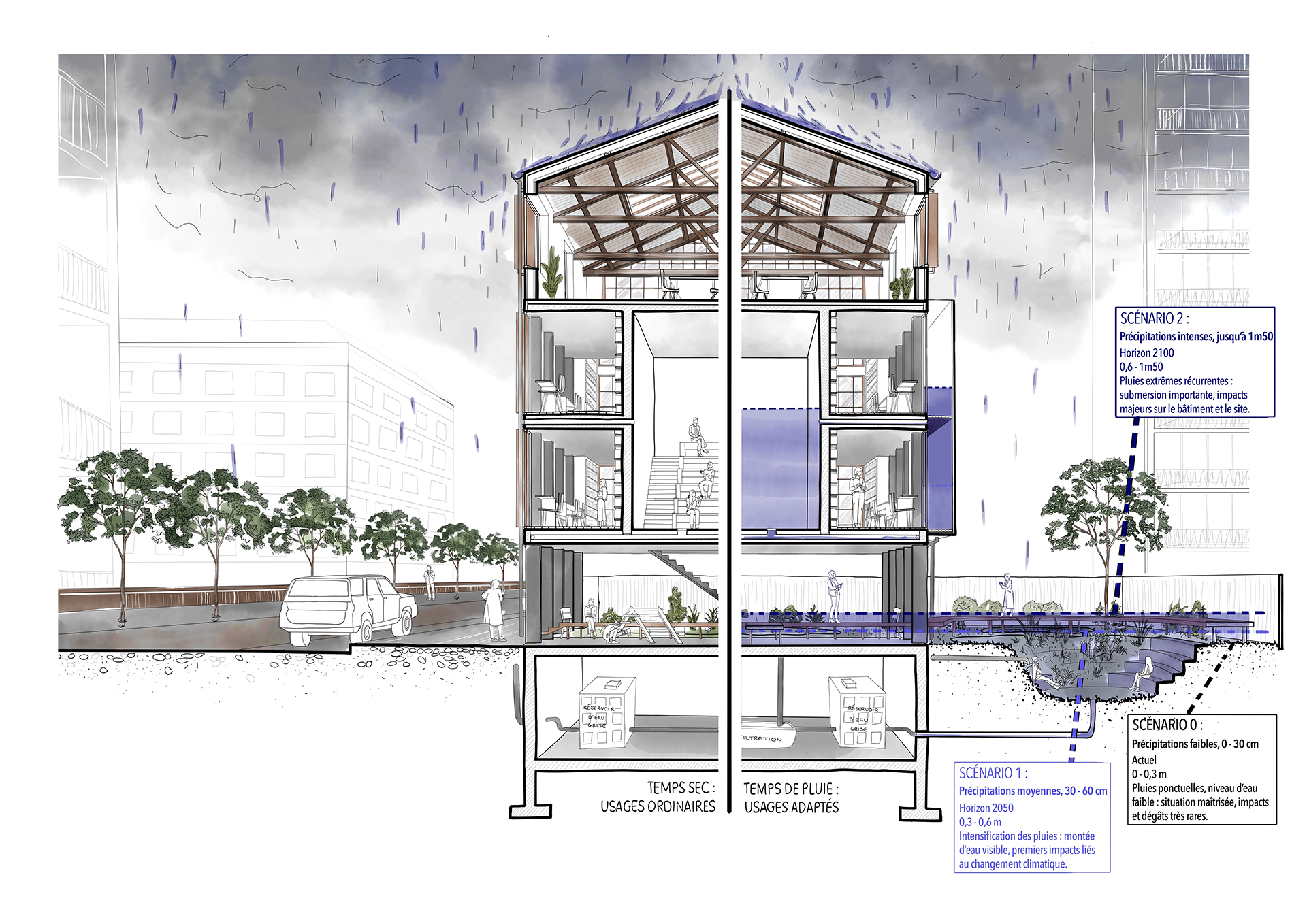 Plutôt que de lutter contre cet aléa climatique, le projet choisit d’apprendre à vivre avec. Le bâtiment devient ainsi une bibliothèque de quartier pensée comme un véritable réservoir, capable d’accueillir à la fois le savoir et l’eau de pluie. Son rez-de-chaussée végétalisé, conçu comme un sol libre et poreux, fonctionne en temps calme comme un jardin public et se transforme, lors des épisodes pluvieux, en paysage amphibie parcouru de pontons.